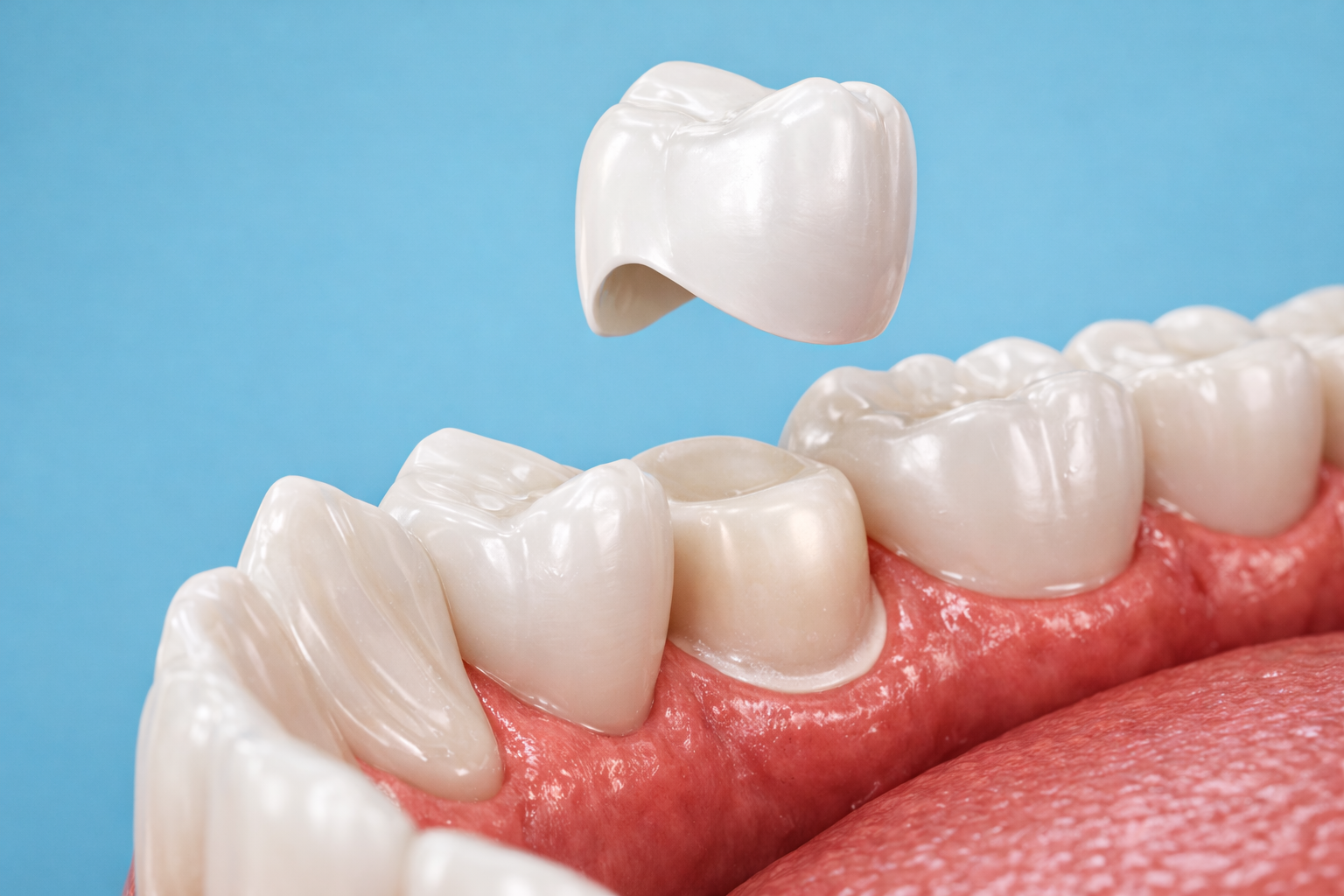 A dental crown is a custom-made covering that fits over a damaged or weakened tooth, restoring its shape, strength, appearance, and function. Think of it as a protective shell designed to reinforce a tooth that can no longer reliably support itself.